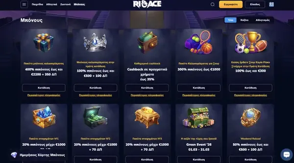 Δομούμε τις προωθητικές ενέργειες έτσι ώστε να βλέπεις τι παίρνεις και τι χρειάζεται να κάνεις στη συνέχεια. Έλεγχε πάντα τους συγκεκριμένους όρους μέσα στον λογαριασμό σου, γιατί ορισμένες προσφορές ισχύουν μόνο για επιλεγμένα παιχνίδια ή χρονικές περιόδους. Αν ψάχνεις για μπόνους καζίνο RioAce χωρίς κατάθεση, σημείωσε ότι δεν εμφανίζεται ως σταθερή προσφορά στη λίστα μπόνους μας για την Ελλάδα, οπότε η διαθεσιμότητα μπορεί να αλλάζει.